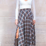 gonna midi a quadri tagliata asimmetrica con spacco frontale e elastico in vita, materiale morbido e caldo