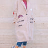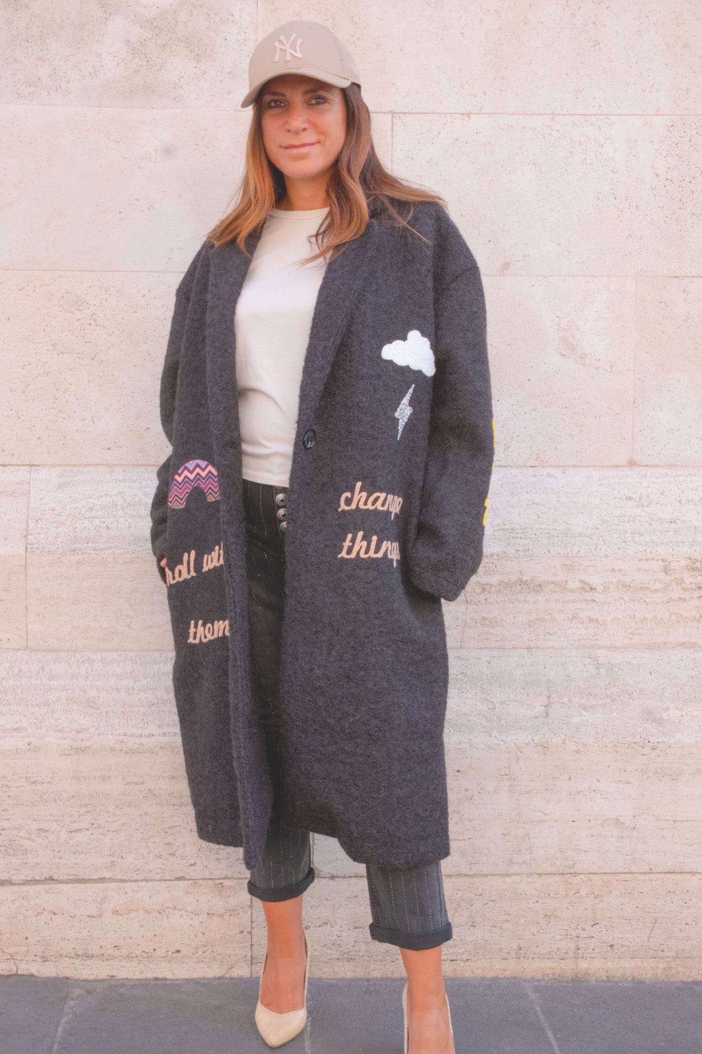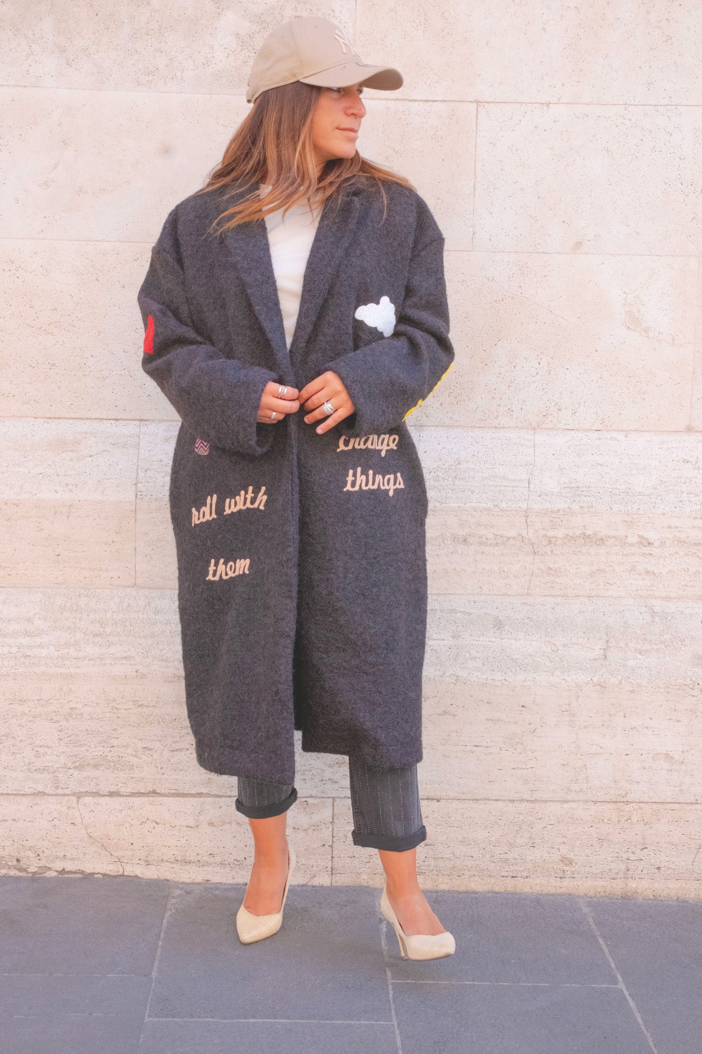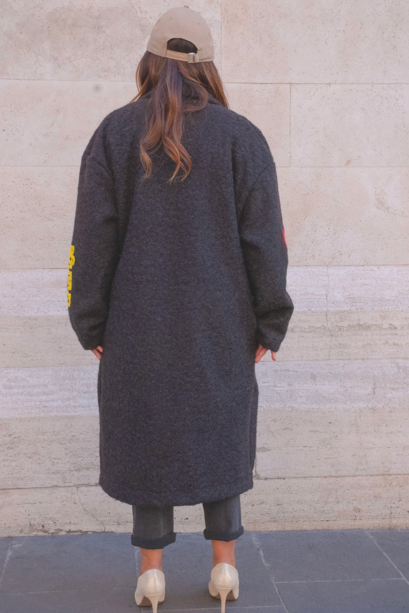giacca lunga coprispalle in materiale pesante con petch applicati