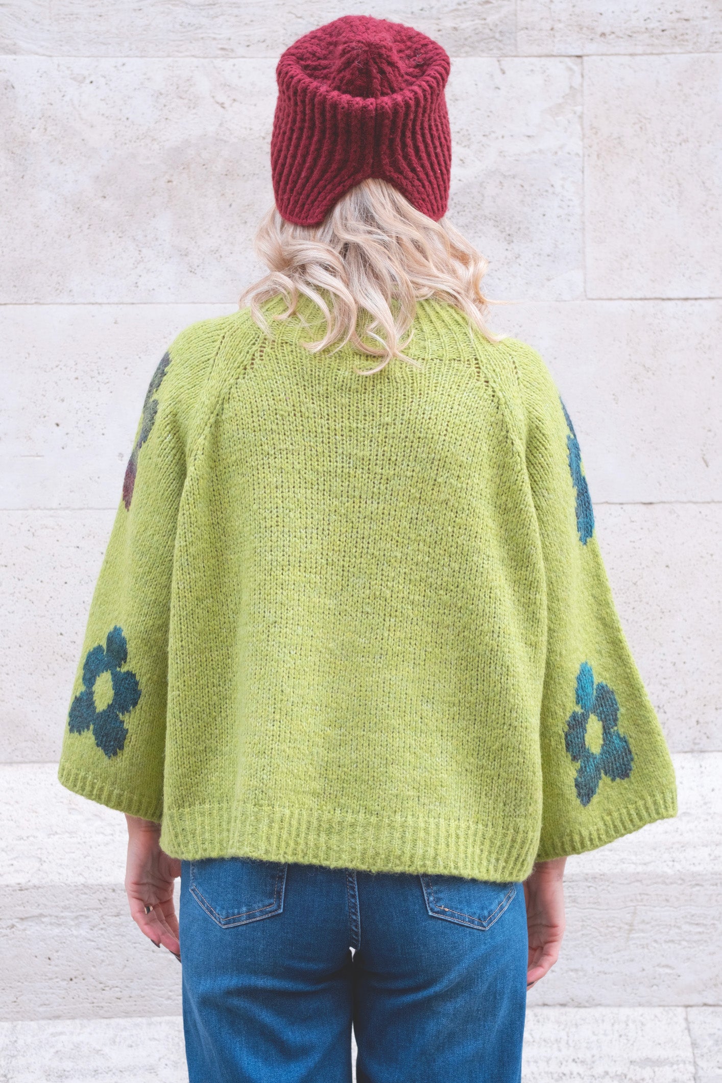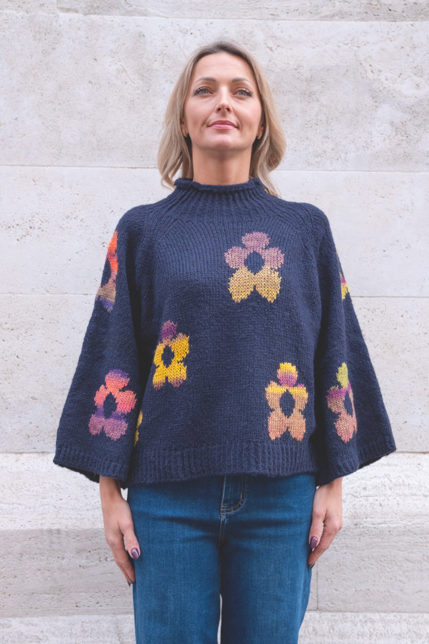 maglione misto lana con ricami a fiori e maniche svasate