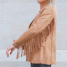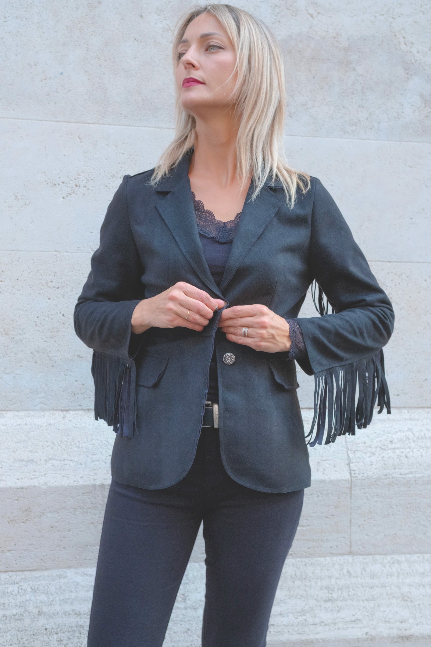 giacca in alcantara con frange sulle maniche e chiusura a bottone