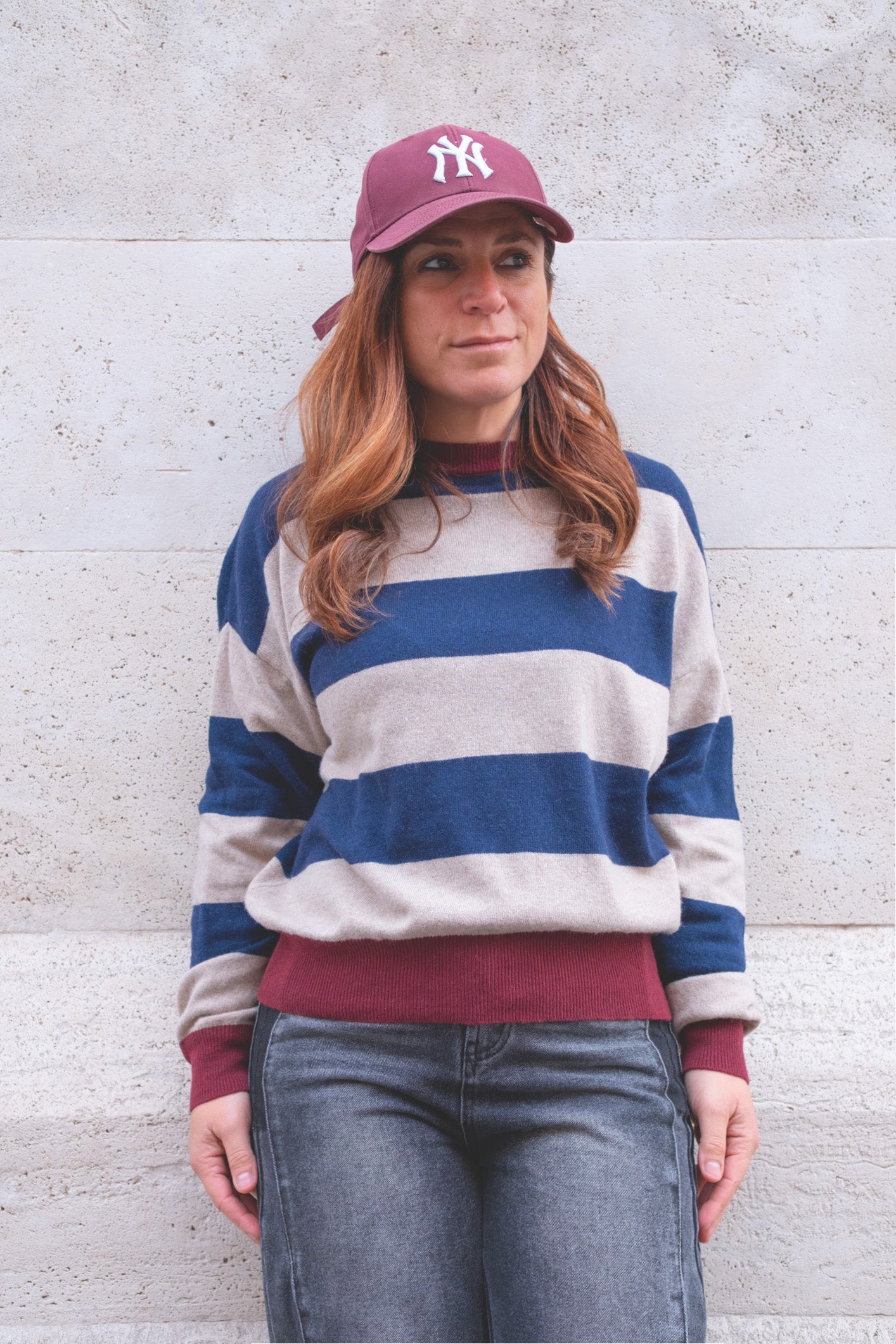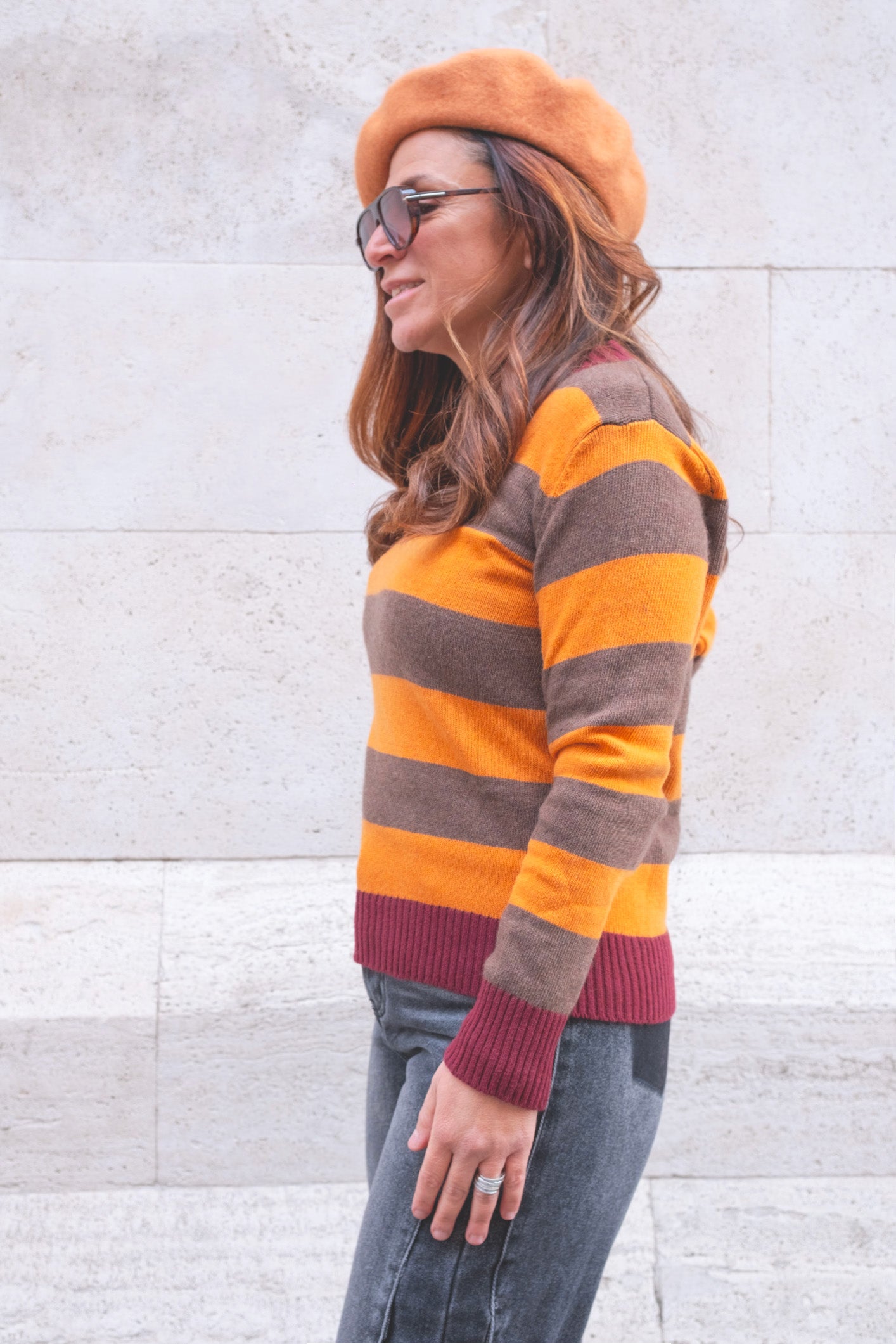 maglione a righe diversi colori striscia bordeaux materiali lana e viscosa morbido e caldo