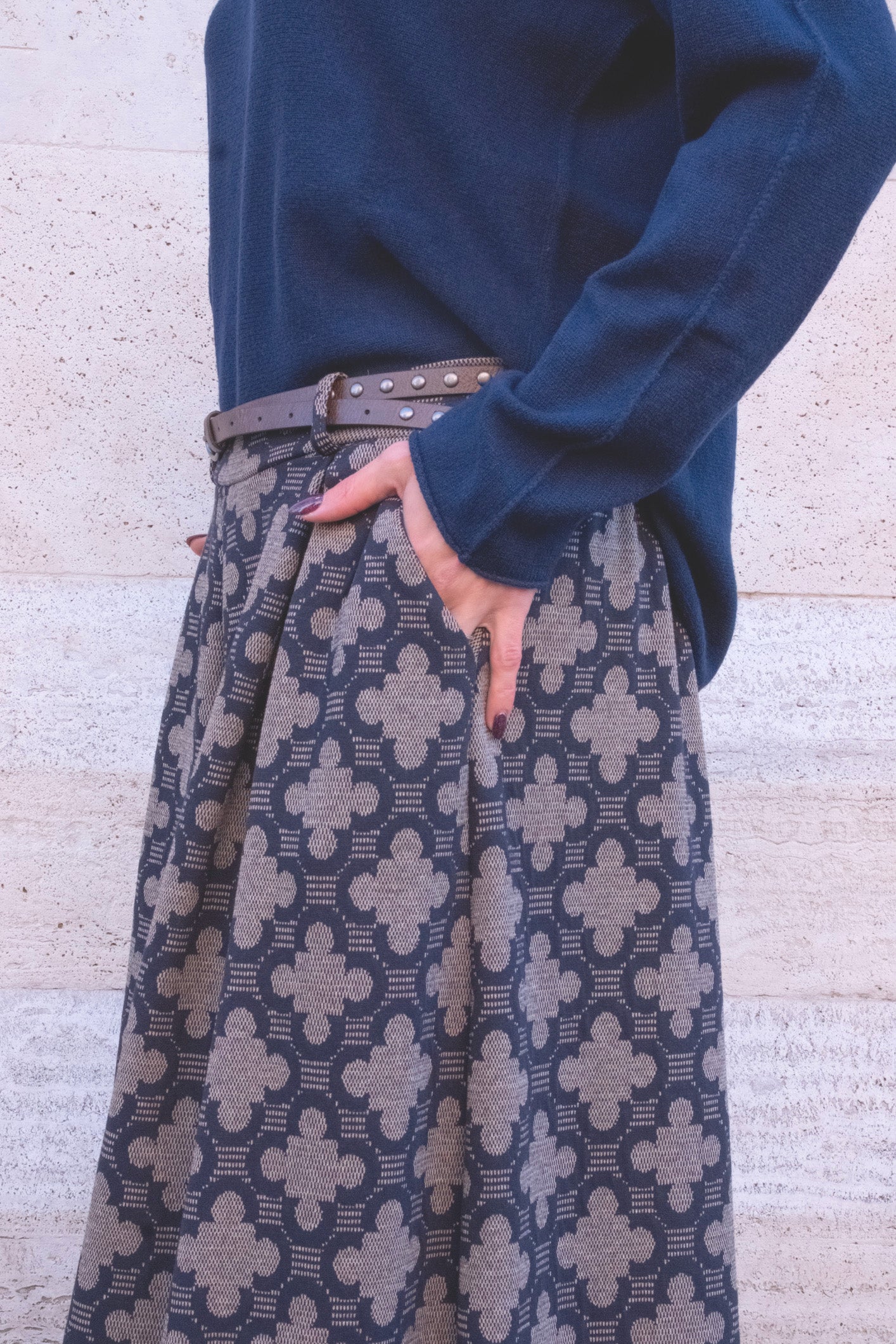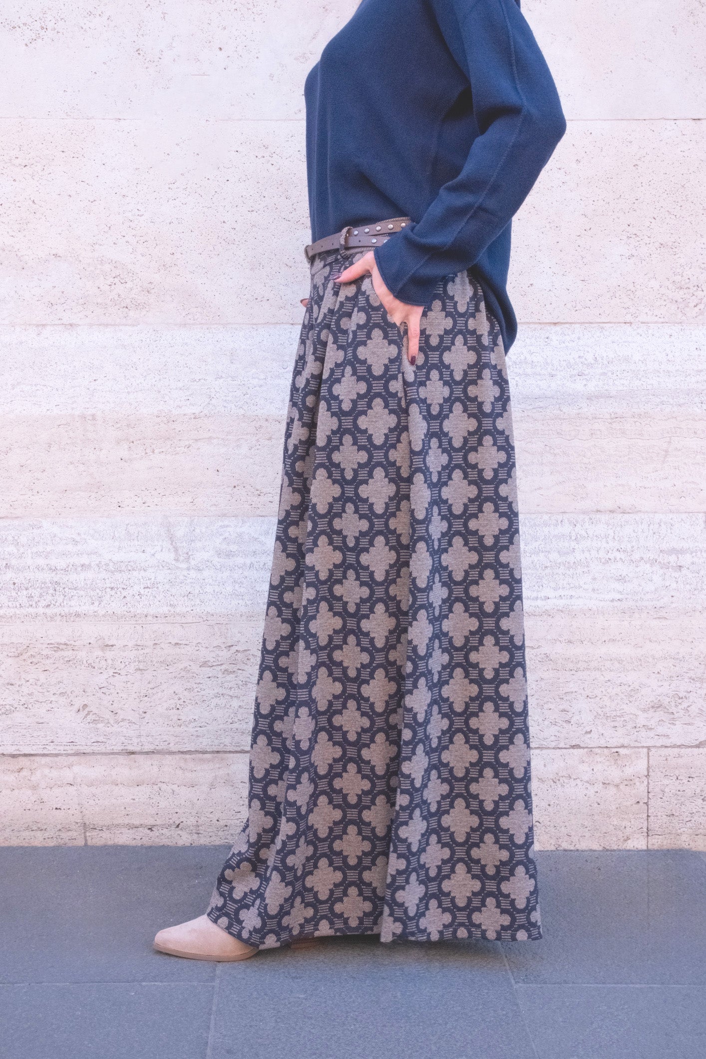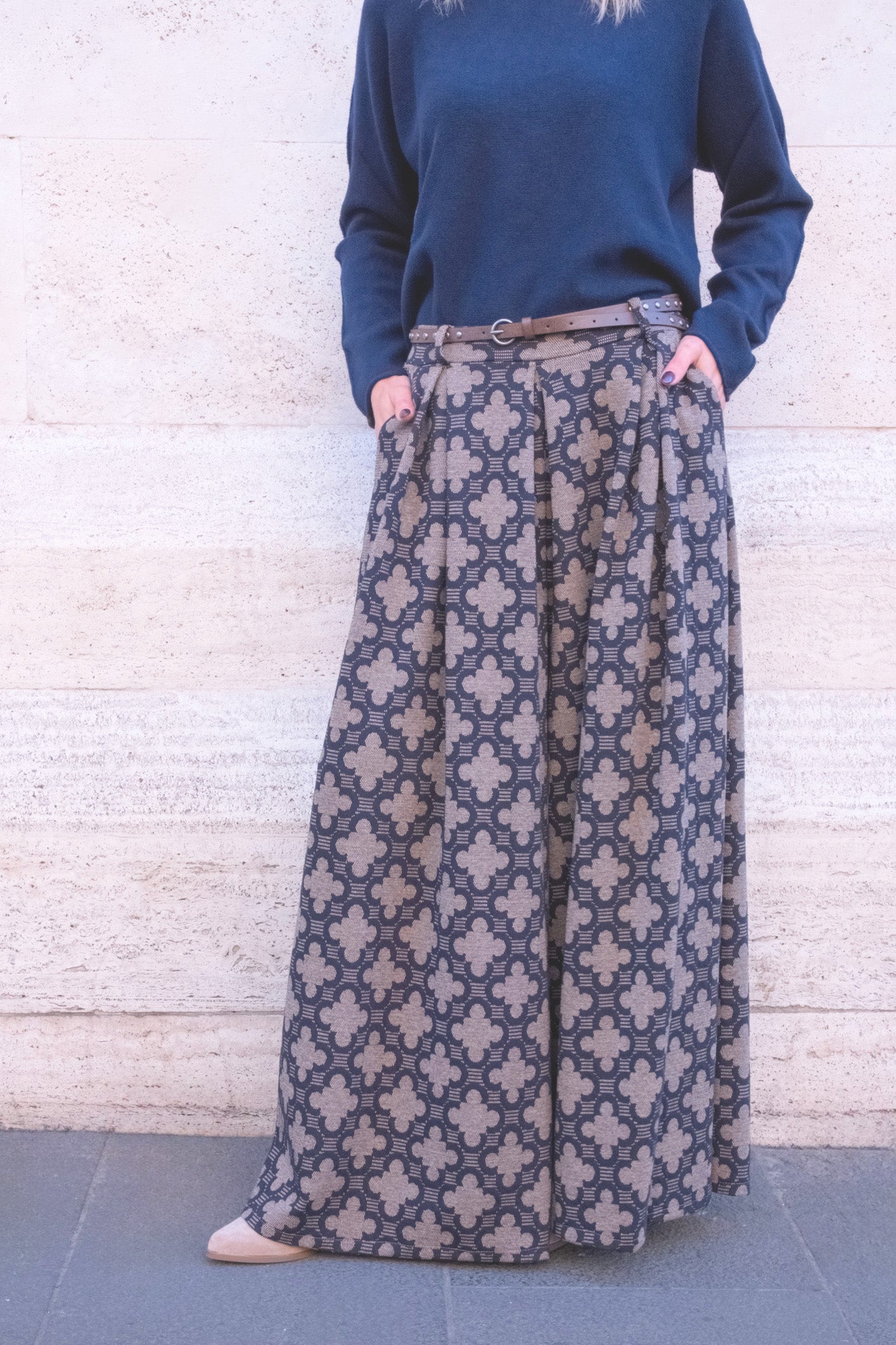 pantalone gonna fantasia ampio con tasche laterali e cinta in vita
